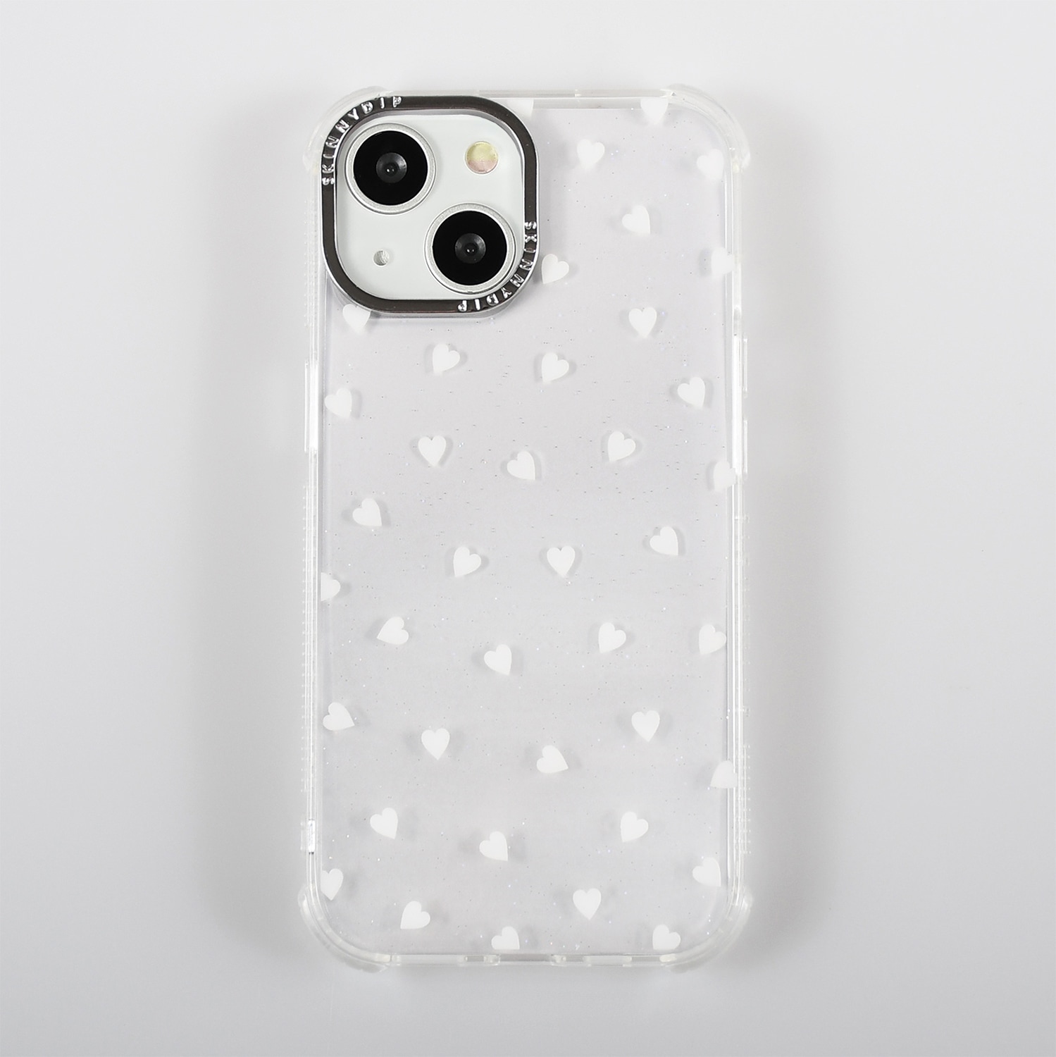 ミニサイズの白いハートを散りばめたシンプルなiPhone用ケース。