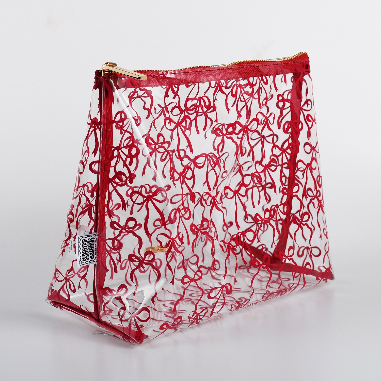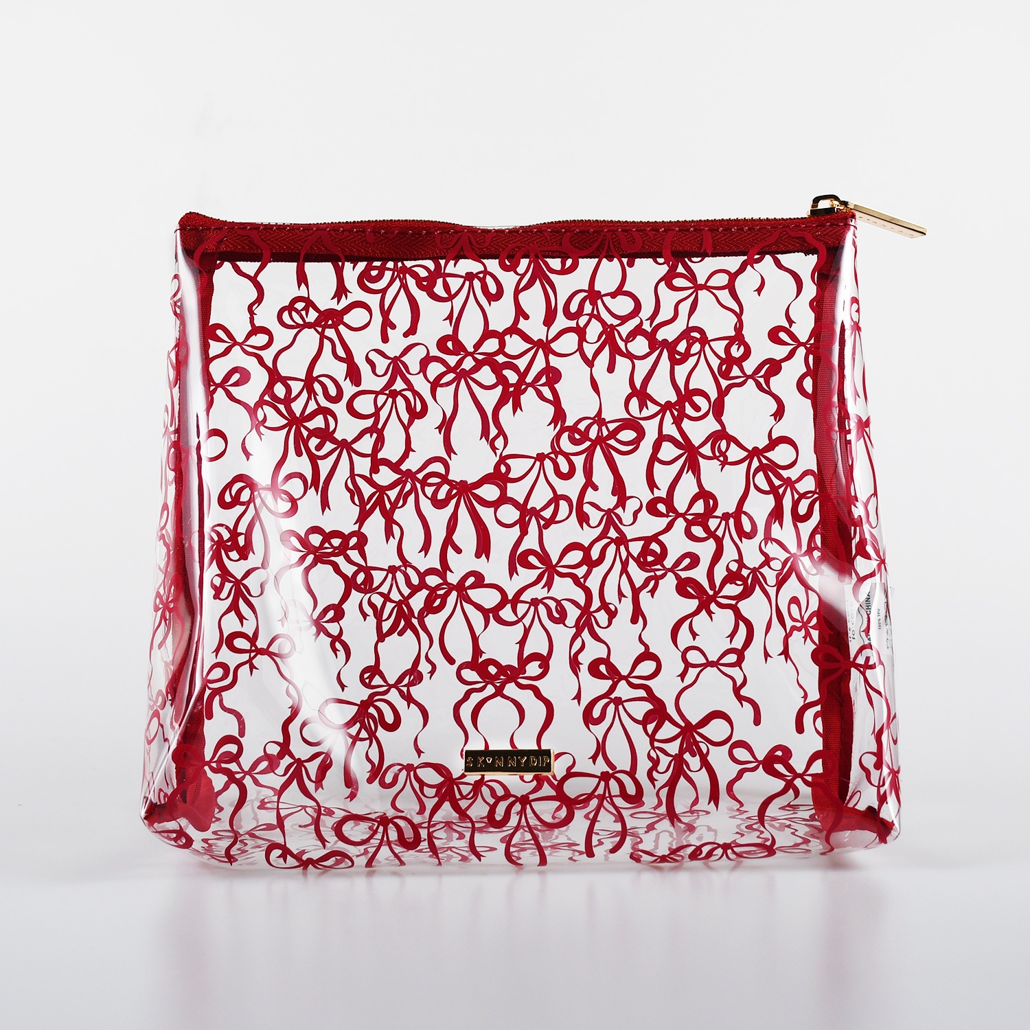 バーガンディ色のリボンが全面にプリントされた大人可愛いデザイン。