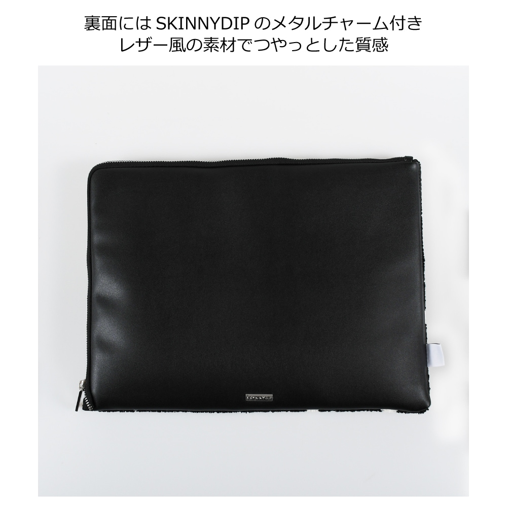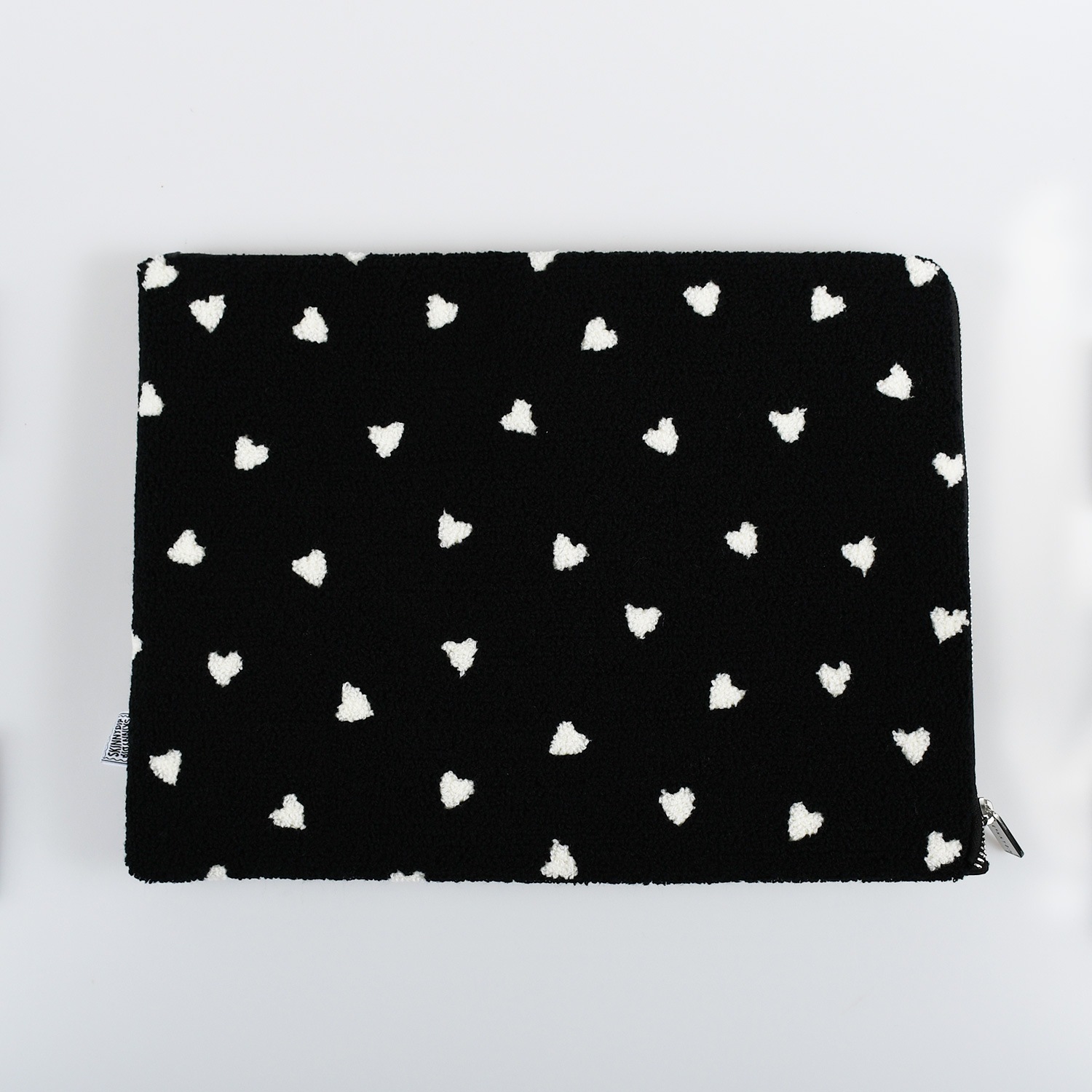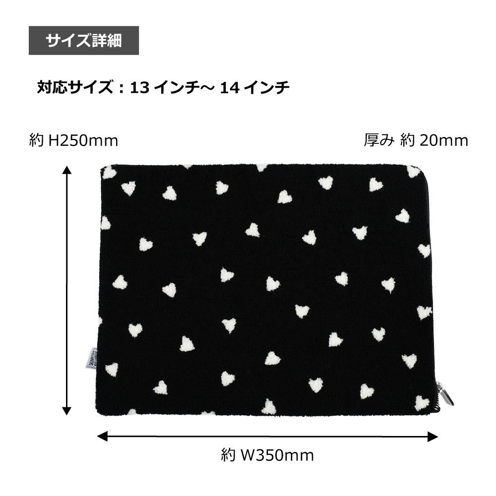 ミニサイズの白いハートを散りばめたもこもこ素材のラップトップケース。