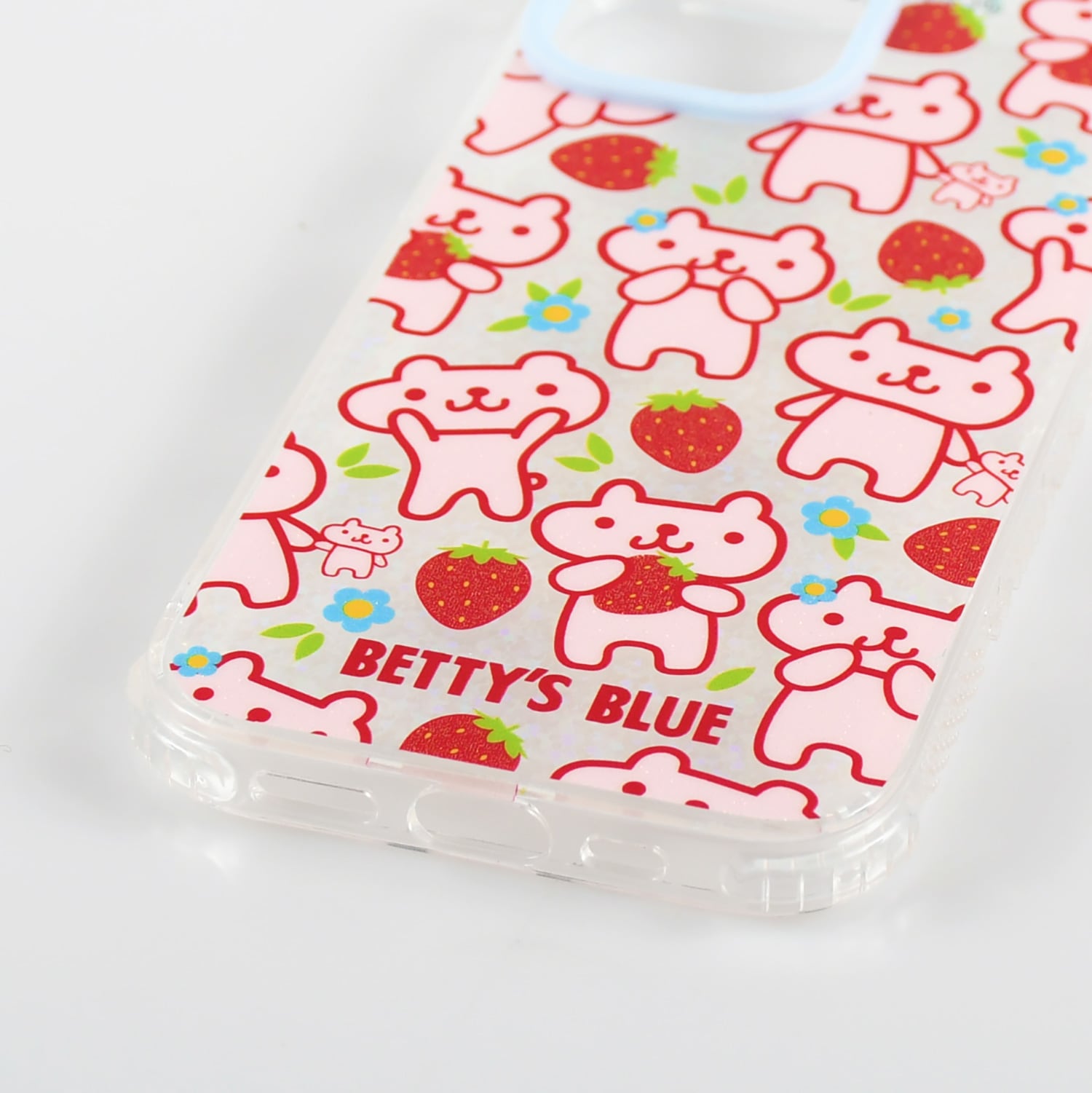 BETTY’S BLUEの当時のショッパ―アートを使用したフォンケースと、エイミーちゃんをグリッターでキラキラにデザインしたフォンケース。